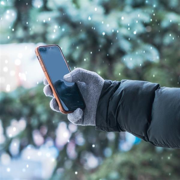 Rękawiczki z PET, rPET i akrylu, które na palcach – kciuku, wskazującym oraz środkowym – posiadają specjalne wstawki, umożliwiające obsługę ekranów dotykowych bez konieczności zdejmowania rękawiczek.