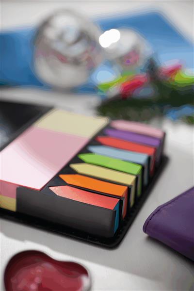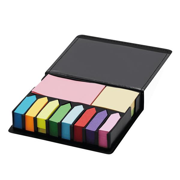 Zestaw do biura i domu REMIND ME zawiera bloczki z samoprzylepnych kartek w kształcie strzałek w 8 kolorach i duży bloczek kartek, przezroczyste okienko, pakowane w pudełko ze skóry ekologicznej. Materiał: Plastik/PVC/Papier Kolor: czarny Tagi: Karteczki samoprzylepne,akcesoria biurowe,karteczki samoprzylepne