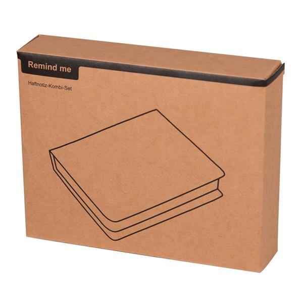 Zestaw do biura i domu REMIND ME zawiera bloczki z samoprzylepnych kartek w kształcie strzałek w 8 kolorach i duży bloczek kartek, przezroczyste okienko, pakowane w pudełko ze skóry ekologicznej.