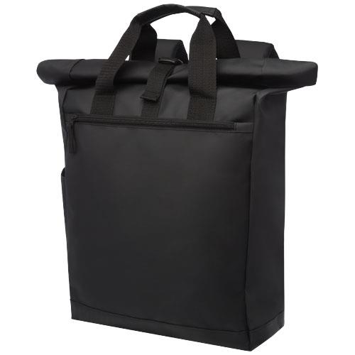 Wodoodporny plecak z wyściełaną przegrodą na laptopa, wyściełanymi, regulowanymi paskami na ramiona, główną komorą zapinaną na zamek błyskawiczny z rolowanym zamknięciem i dwoma uchwytami do przenoszenia.