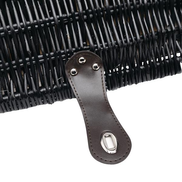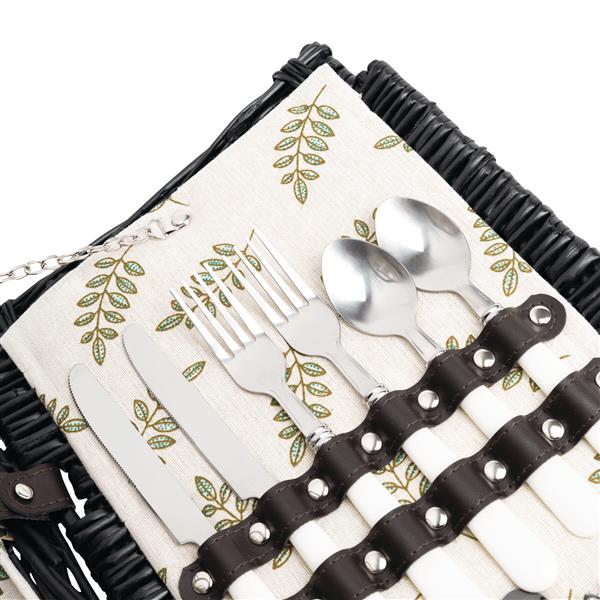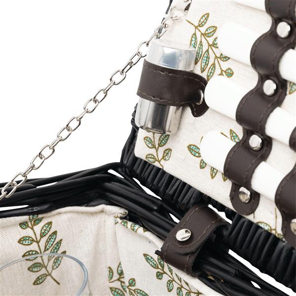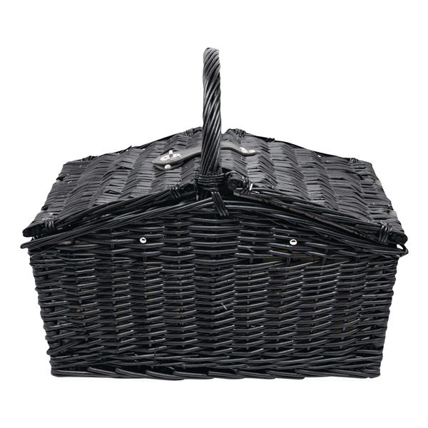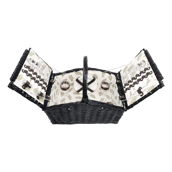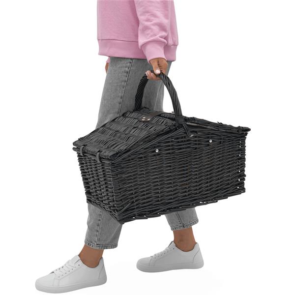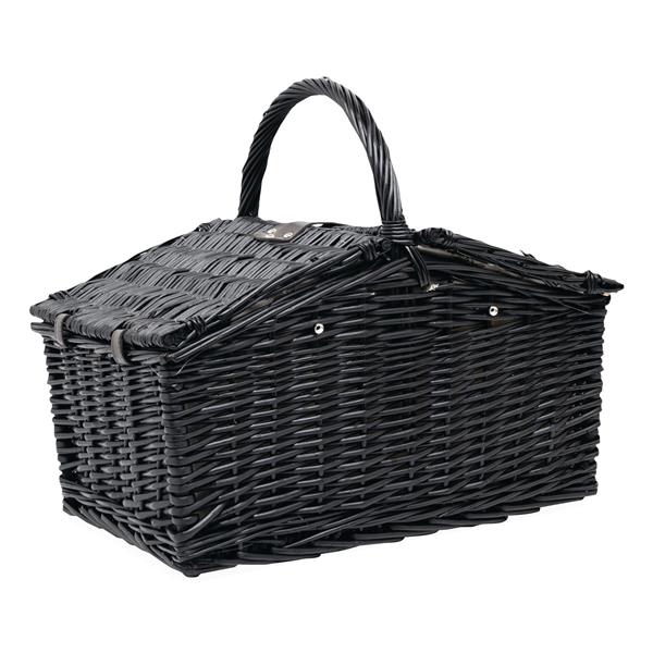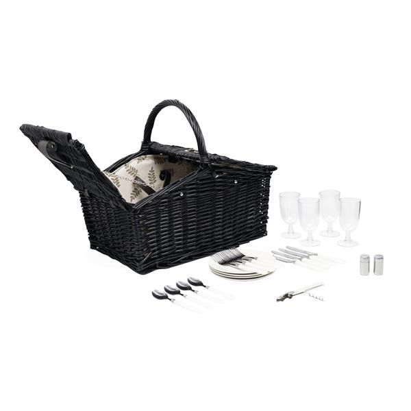 Wiklinowy kosz piknikowy RICHMOND PARK dla 4 osób zawiera sztućce ze stali nierdzewnej z plastikowymi uchwytami, ceramiczne talerze, plastikowe kieliszki na wino, 1 nóż kelnerski, solniczkę i pieprzniczkę. Wewnątrz paski spinające, podszewka wykonana ze 100% lnu, na zewnątrz uchwyt i przekręcane zamknięcie.