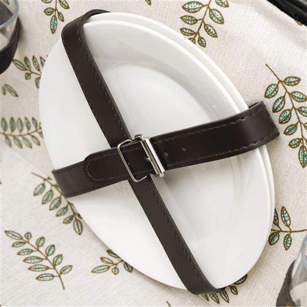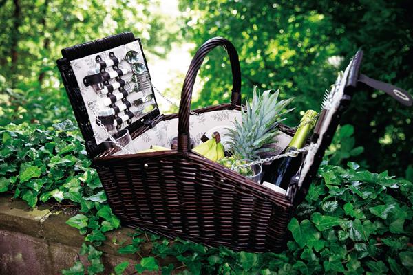 Wiklinowy kosz piknikowy RICHMOND PARK dla 4 osób zawiera sztućce ze stali nierdzewnej z plastikowymi uchwytami, ceramiczne talerze, plastikowe kieliszki na wino, 1 nóż kelnerski, solniczkę i pieprzniczkę. Wewnątrz paski spinające, podszewka wykonana ze 100% lnu, na zewnątrz uchwyt i przekręcane zamknięcie. Tagi: Akcesoria piknikowe,outdoor,artykuły rekreacyjne,akcesoria do grilla Kolor: ciemnobrązowy Materiał: Drewno/Stal nierdzewna/Plastik/Ceramika/Inu