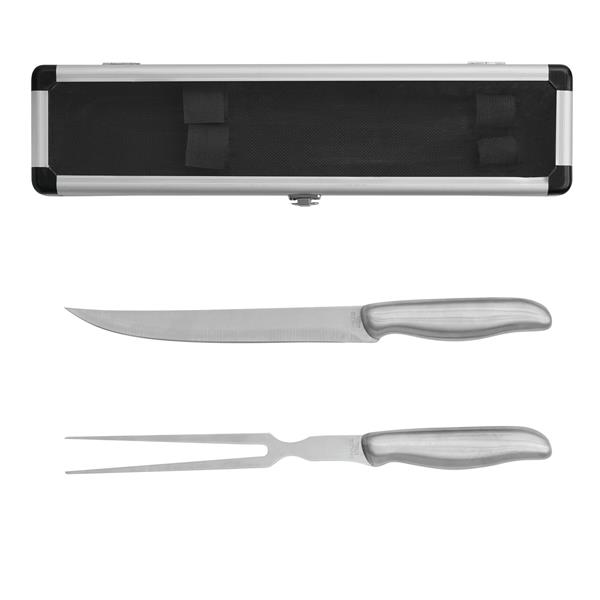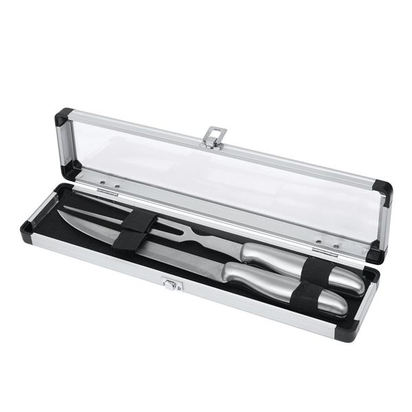 Zestaw sztućców ROASTBEEF wykonanych ze stali nierdzewnej, zawiera nóż i widelec, zapakowany w aluminiowe etui z przezroczystą pokrywką.