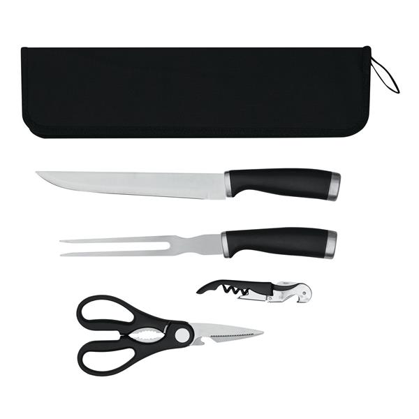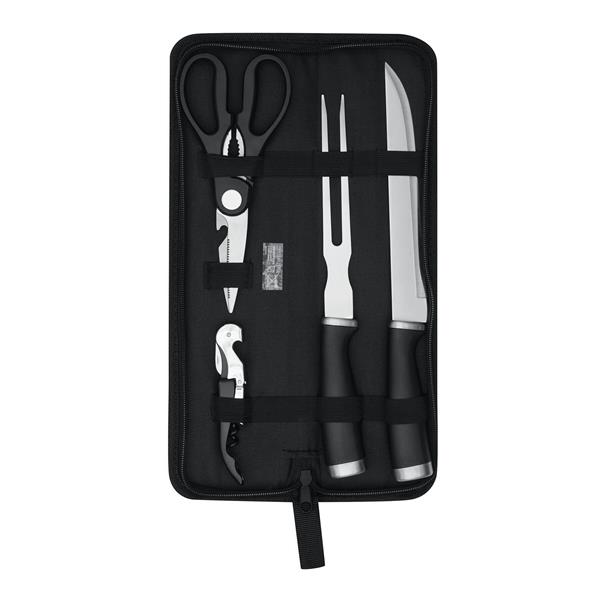 Zestaw do krojenia ze stali nierdzewnej ROASTY. Zawiera 4 elementy: nóż do mięsa, widelec do mięsa, nożyczki oraz nóż kelnerski. W czarnej nylonowej torbie z pętelką.