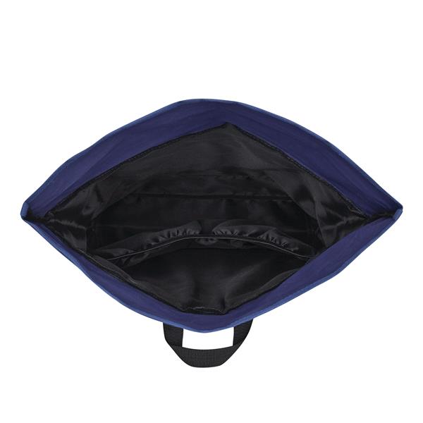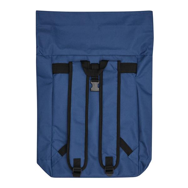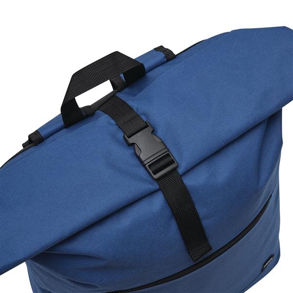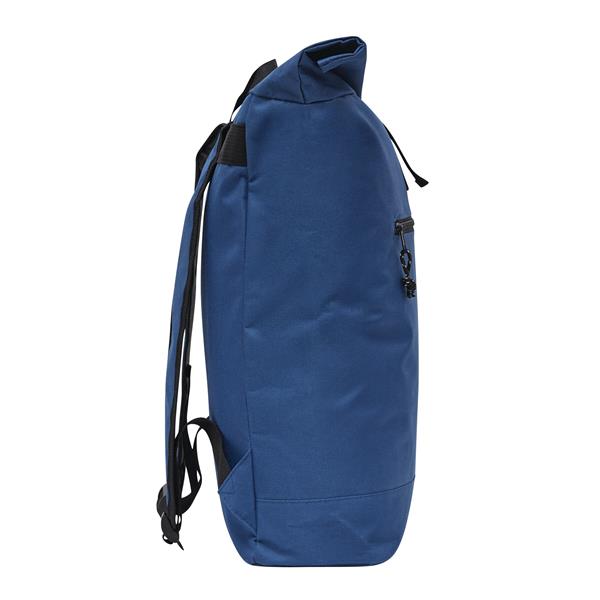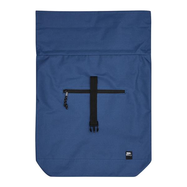 Plecak ROLL-TOP wykonany jest z tworzywa sztucznego pochodzącego z recyklingu (RPET). Posiada poziomą komorę przednią zapinaną na zamek błyskawiczny oraz dużą komorę główną z wyściełaną przegrodą wewnętrzną na laptopa lub tablet. Plecak można zwiniąć i zamknąć na zatrzask. Ma wygodny pasek do przenoszenia oraz wyściełaną podstawę, szelki i plecy.