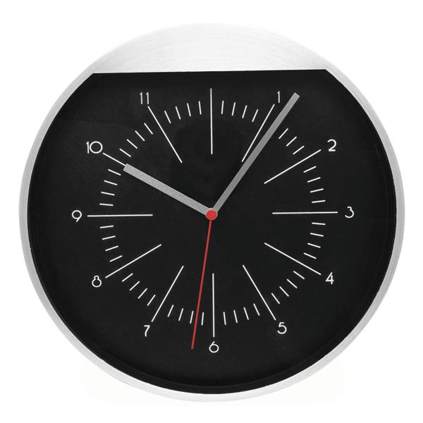 Zegar ścienny ROUNDABOUT. Aluminiowa rama i tarcza z szeroką krawędzią na Twoje logo. Materiał: Aluminium/Plastik/Szkło Kolor: czarny, srebrny Tagi: zegary ścienne,zegary