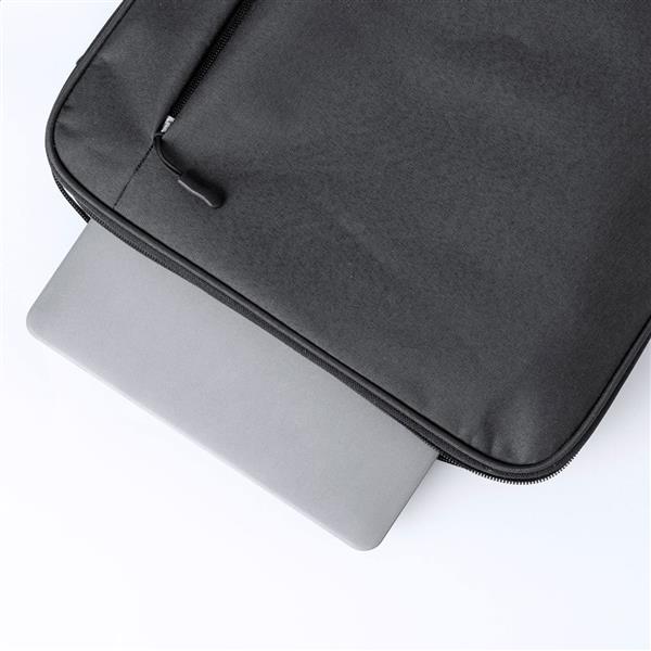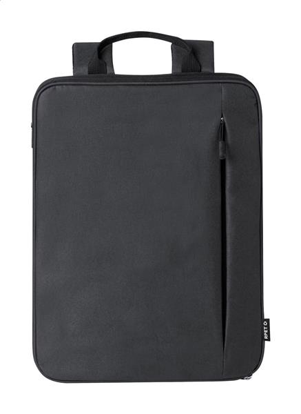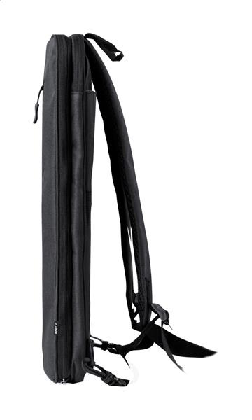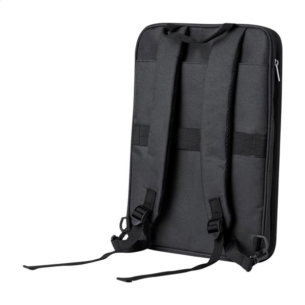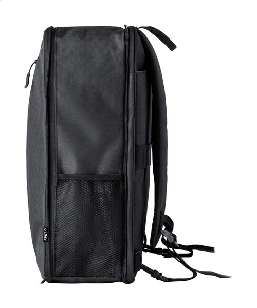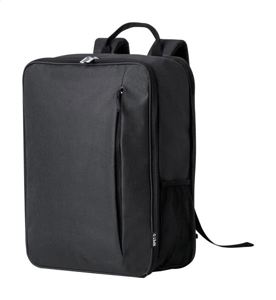 Rozsuwany plecak RPET z przegrodami zapinanymi na zamek, wyściełaną przegrodą na laptopa (15″) i tablet (10″), wyściełanymi plecami i paskami naramiennymi. Poliester 300D RPET z charakterystyczną metką RPET.