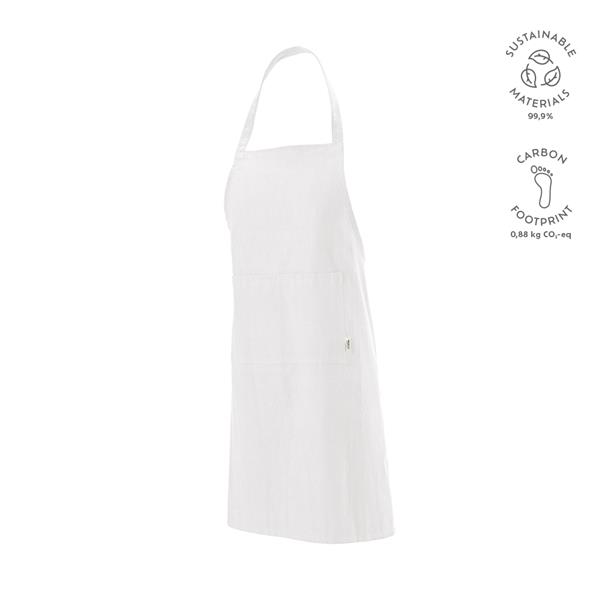 Wygodny, przyjazny dla środowiska fartuch wykonany z bawełny pochodzącej z recyklingu o gramaturze 180 g/m2, wyposażony w paski na szyję i dwie wygodne przednie kieszenie zapewniające dodatkową funkcjonalność. Dostarczany w indywidualnej biodegradowalnej torebce foliowej.