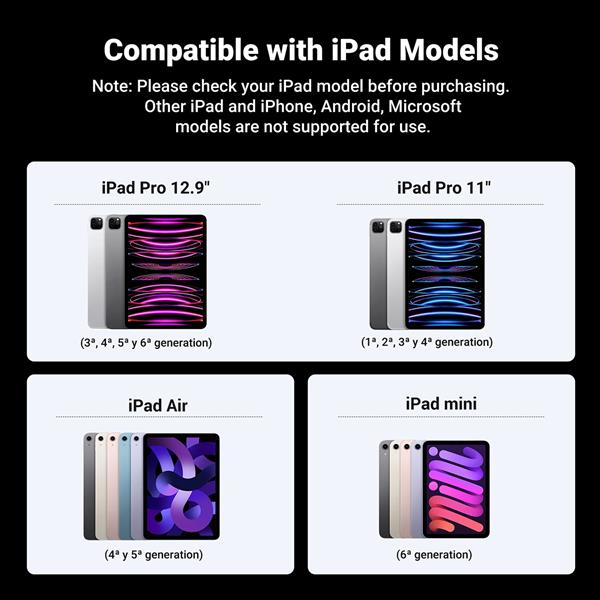 Rysik Ugreen LP653 zapewnia pełną kompatybilność z szeroką gamą modeli tabletów Apple: iPadami Pro 11 cali (1 / 2 / 3 / 4 gen.), iPadami Pro 12,9 cala (3 / 4 / 5 / 6 gen.), iPadami Air ( 4 / 5 gen.) oraz iPadami mini 6 gen. Bez względu na to, który z wymienionych modeli posiadasz, ten rysik został zaprojektowany, by współpracować z Twoim urządzeniem. Możesz cieszyć się płynnym i niezawodnym działaniem rysika, bez obaw o niekompatybilność.