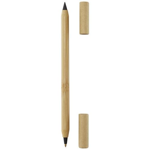 Samambu podwójny długopis z bambusa z dwoma końcówkami: 1 długopis i 1 długopis bez atramentu. Końcówka bez atramentu nie wymaga wkładów atramentowych ani uzupełniania. Czarna grafitowa końcówka długopisu została zaprojektowana tak, aby pozostawiać widoczne ślady w kontakcie z powierzchnią do pisania. Wybór długopisu wykonanego z bambusa promuje dokonywanie bardziej przyjaznych dla środowiska wyborów i zachęca do korzystania z materiałów odnawialnych. Długopis ma niebieski tusz, końcówkę o średnicy 1,00 mm i długość linii pisania wynoszącą 600 metrów. Długość linii pisania długopisem bez atramentu: 1500 metrów.