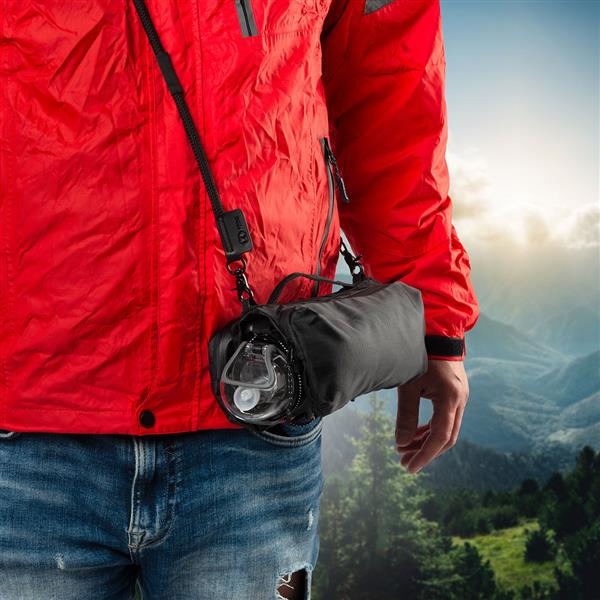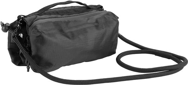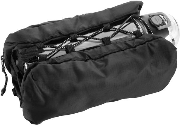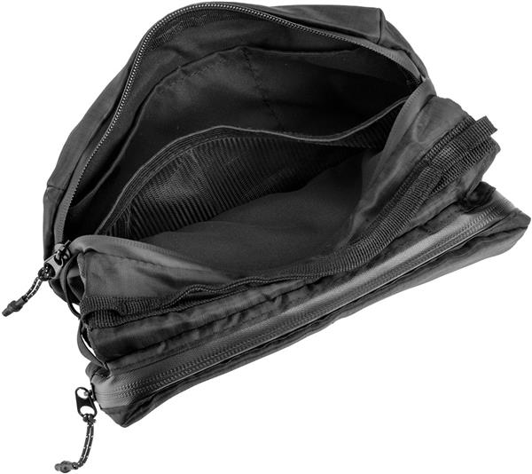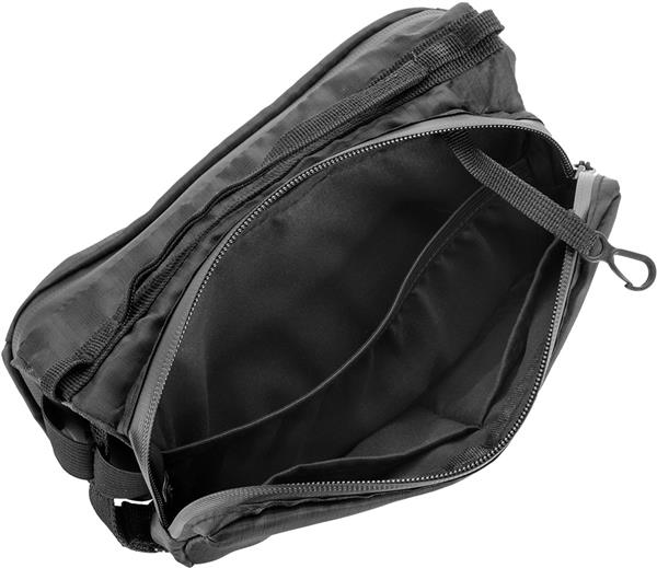 Poręczna saszetka, posiada dwie duże kieszenie, zamykane na zamek. W jednej kieszeni znajdują się dwie przegórdki oraz kieszeń z siatki. W drugiej, trzy przegródki oraz karabińczyk, do którego można przypiąć np. klucze. Środkowa przestrzeń między dużymi kieszeniami jest połączona elastycznym sznurkiem i tworzy idealne miejsce do przenoszenia butelki.