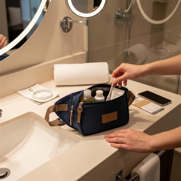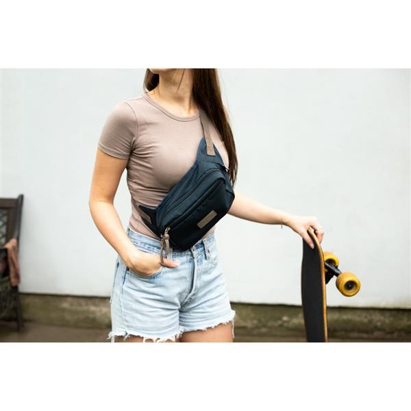 Saszetka zapinana w pasie B’RIGHT, zgodna z certyfikatem GRS (Global RecycIed Standard), wykonana z RPET, przegroda główna oraz przednia kieszeń na zamek błyskawiczny, wewnątrz kieszeń siateczkowa na zamek błyskawiczny, wnętrze wykończone podszewką w kolorze regulowanego paska biodrowego, zapięcie na klamrę, min. obwód ok. 63 cm, max. obwód ok. 109 cm