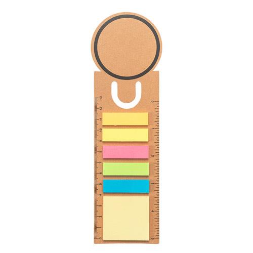 Zestaw biurowy 3 w 1 wykonany w 100% z papieru pochodzącego z recyklingu, z zaokrąglonymi krawędziami i czarnym nadrukiem na brzegach. Zawiera jeden blok karteczek samoprzylepnych (60 g/m2) z 15 arkuszami w 100% z papieru pochodzącego z recyklingu w kolorze żółtym oraz pięć małych bloków karteczek samoprzylepnych, każdy z 15 arkuszami, wykonanych w 100% z papieru pochodzącego z recyklingu w różnych kolorach: pomarańczowym, żółtym, różowym, jasnozielonym i niebieskim. Na marginesach znajdują się dwie linijki: lewa ma skalę w centymetrach (cm), a prawa w calach. Jego wszechstronność pozwala na używanie go jako zakładki lub spinacza po przymocowaniu do zestawu kartek. 215 x 60 mm