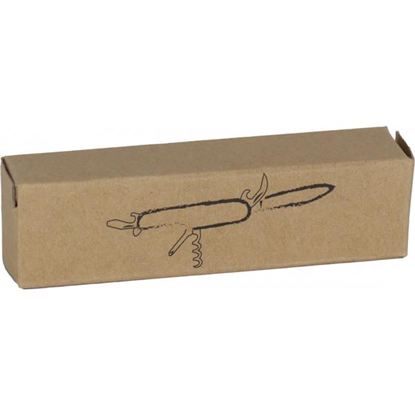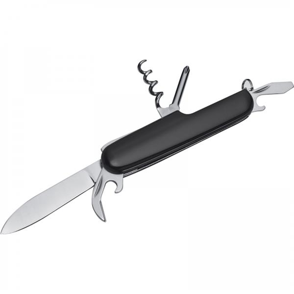 Scyzoryk z aluminium i stali nierdzewnej, posiadający 7 funkcji: nożyk, otwieracz do puszek i butelek, korkociąg, śrubokręt oraz brelok.