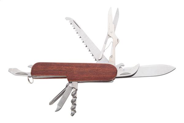 Scyzoryk ze stali nierdzewnej z drewnianą wykończeniem i 9 funkcjami.
