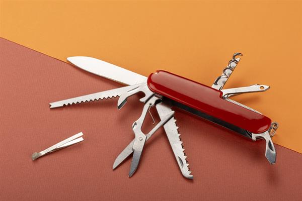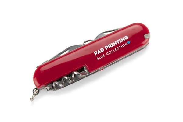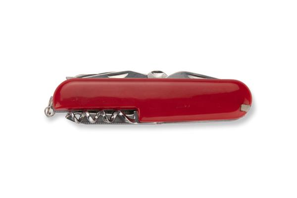 Scyzoryk HIDI z rękojeścią w kolorze czerwonym, wykonaną z tworzywa. Posiada wszystkie niezbędne funkcje: nóż, piła, skrobak do ryb, nożyczki, otwieracz do puszek, otwieracz do butelek, śrubokręt, korkociąg, szydło oraz dziurkacz do skór.