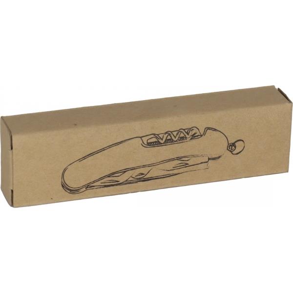 Scyzoryk wykonany ze stali nierdzewnej. Funkcje: otwieracz do puszek, nożyczki, narzędzie do zdejmowania haczyka, skrobak do łusek, nóż ząbkowany, nóż, śrubokręt płaski, otwieracz do wina, pilnik, śrubokręt Phillips, rozwiertak.