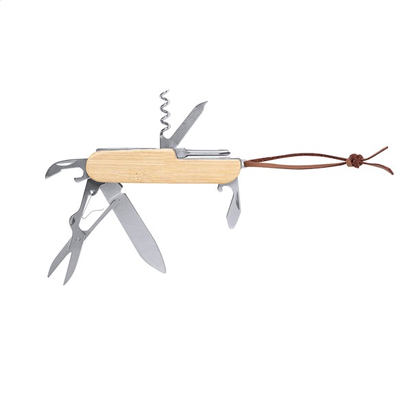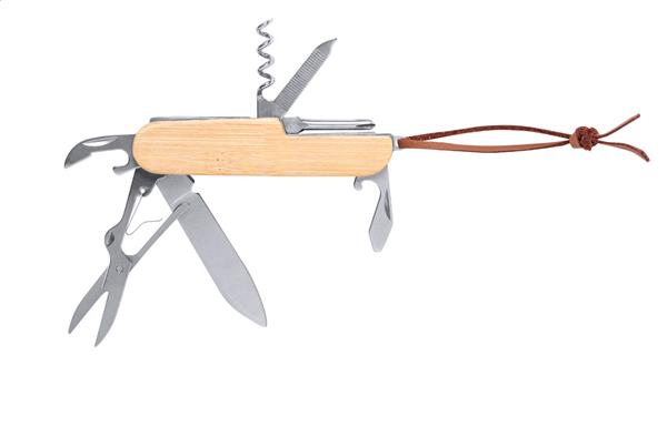 Scyzoryk ze stali nierdzewnej z bambusową rękojeścią i 9 funkcjami. Z paskiem do noszenia ze skóry PU.