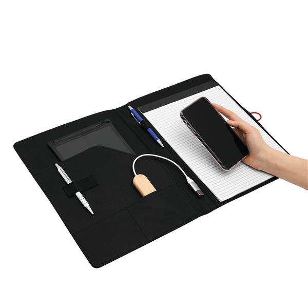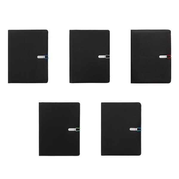 Portfolio SESSION w formacie A4, zawiera notes, pętelkę na przybory do pisania, różne wsuwane kieszenie, metalowy haczyk z kolorową gumką do zamknięcia.