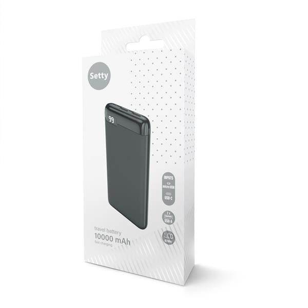 Power bank marki Setty o pojemności 10000 mAh, wyposażony w dwa wyjścia USB oraz dwa wejścia -jedno typu micro-USB, a drugie USB-C. Taka pojemność wystarczy na kilkukrotne naładowanie większości telefonów dostępnych na rynku. Wyświetlacz LCD poinformuje nas o poziomie naładowania baterii, a niewielkie rozmiary pozwalają na to, aby zawsze mieć go przy sobie. Jest jednym z niezbędnych akcesoriów, które sprawdzą się w podróży, w szkole czy podczas treningu. Zestaw zawiera kabel micro USB.