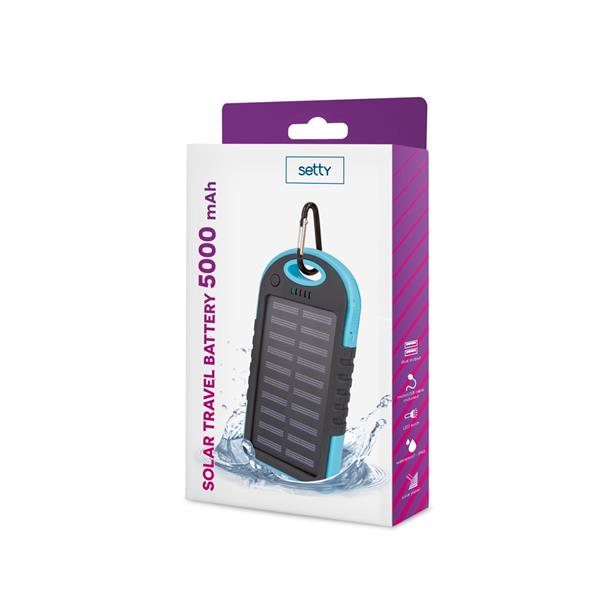 Power bank solarny marki Setty o pojemności 5000 mAh. Naładuj swoje urządzenie energią słoneczną, nie potrzebujesz już do tego prądu! Nie musisz także martwić się o to, że Twój power bank wyczerpie swoją baterię. Urządzenie posiada port wejściowy micro USB. Do zestawu dołączony jest kabel micro USB oraz karabińczyk.