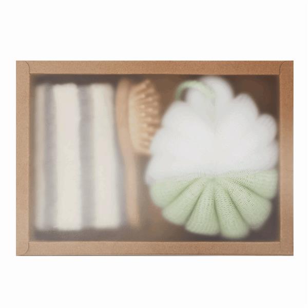 Zestaw wellness SHORT WAVE z gąbką i rękawicą złuszczającą oraz szczotką do włosów. Zapakowane w pudełku.