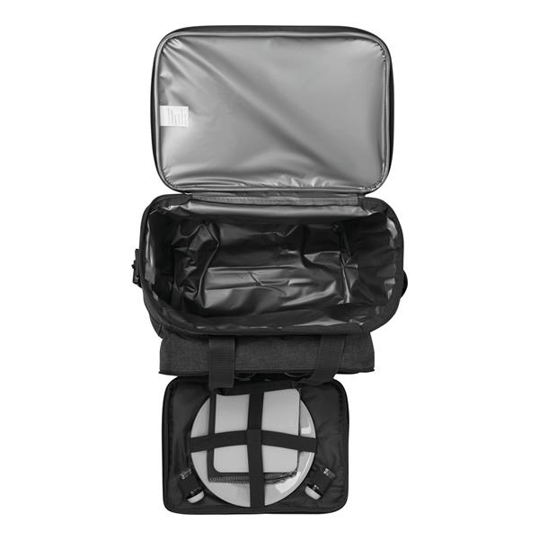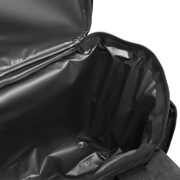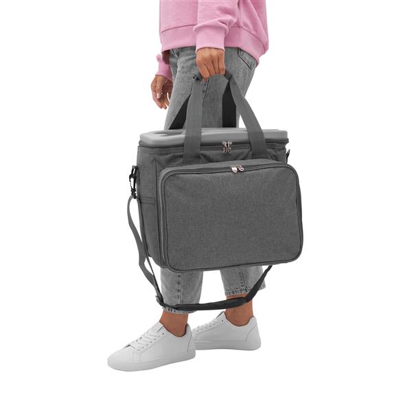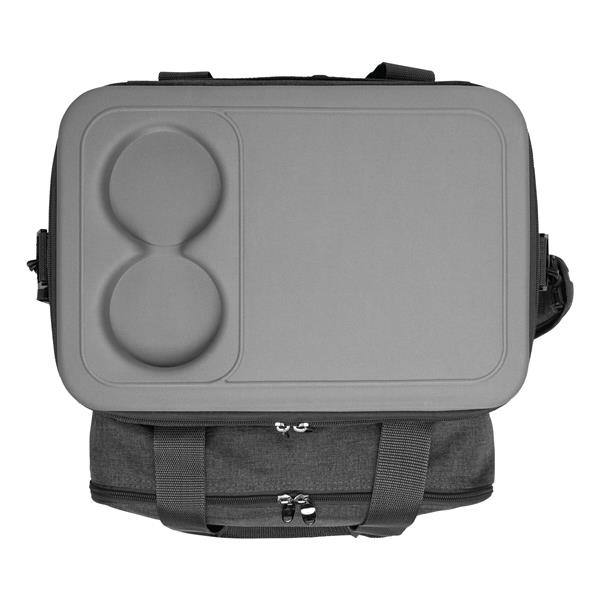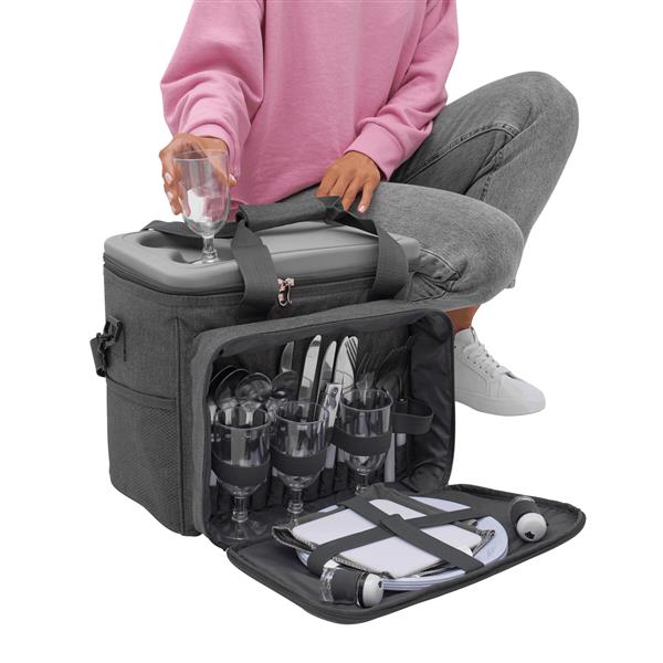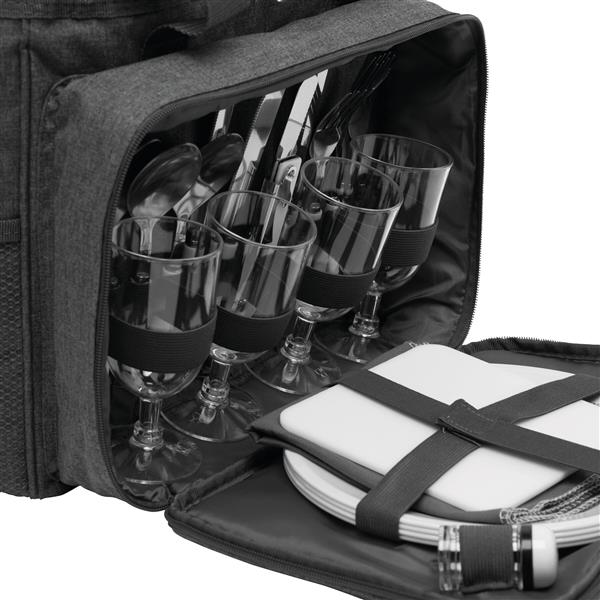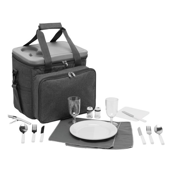 Torba piknikowa SIDE TRIP dla 4 osób z izolowaną kieszenią główną zapinaną na zamek. Wieko może służyć jako mini stolik z uchwytem na kubek. Przednia kieszeń zapinana na zamek zawiera plastikowe naczynia, plastikowe kieliszki do wina, nóż kelnerski, materiałowe serwetki, solniczkę, pieprzniczkę oraz deskę do krojenia. Dwie kieszenie boczne z siatki, regulowane i odpinane szelki, 2 uchwyty do przenoszenia.