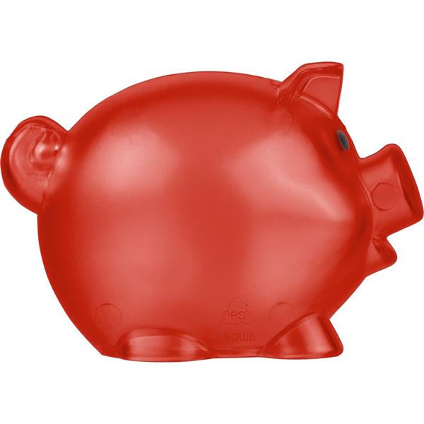 Skarbonka „świnka”, ikona recyklingu na produkcie, zapakowany w woreczek foliowy z recyklingu, produkt wykonany z plastiku z recyklingu