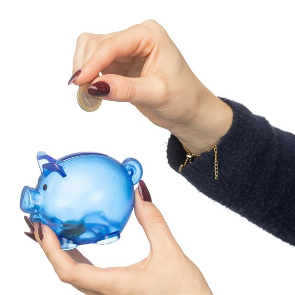 Skarbonka „świnka”, ikona recyklingu na produkcie, zapakowany w woreczek foliowy z recyklingu, produkt wykonany z plastiku z recyklingu