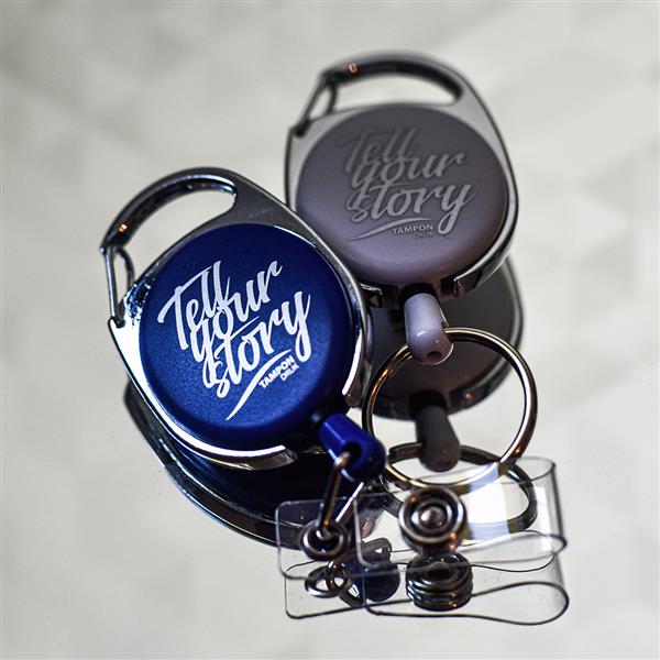 Wykonany z metalu i plastiku ski-pass z winylowym troczkiem, karabińczykiem i klamrą do paska. Długość linki 86 cm.