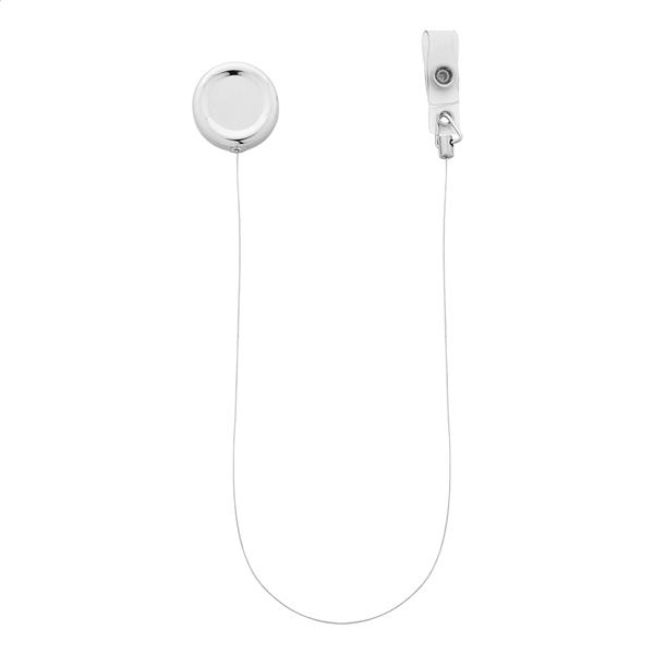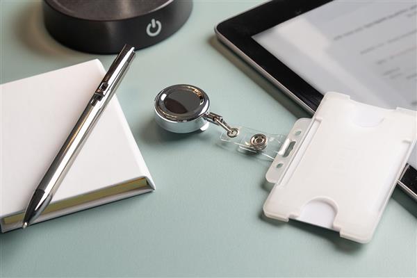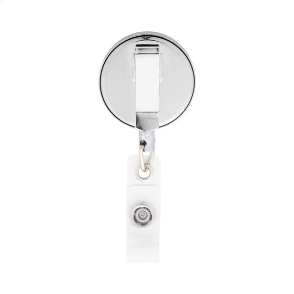 Ekskluzywny metalowy uchwyt na identyfikator z połyskującym metalicznym wykończeniem. Zapinany na zatrzask, z teleskopową linką i metalowym klipsem.