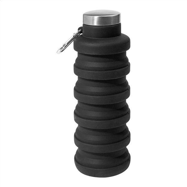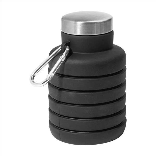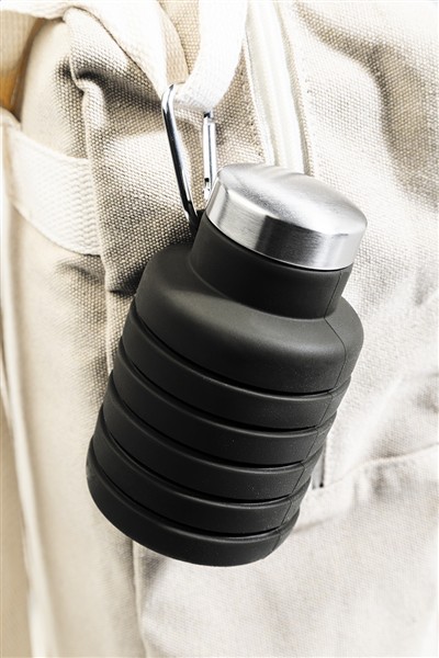 Składana butelka silikonowa ze stalową pokrywką i aluminiowym karabińczykiem. 500 ml.