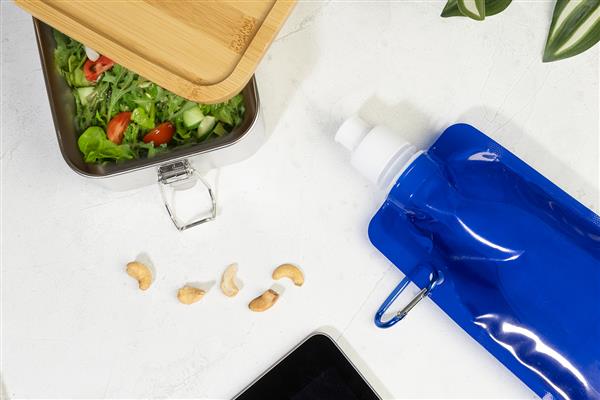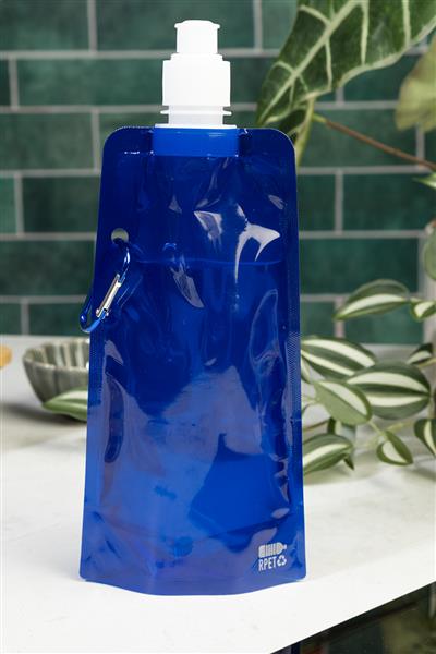 Składana butelka sportowa RPET z pokrywką i aluminiowym karabińczykiem, 500 ml. Bez BPA. Nie nadaje się do napojów gazowanych.