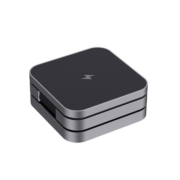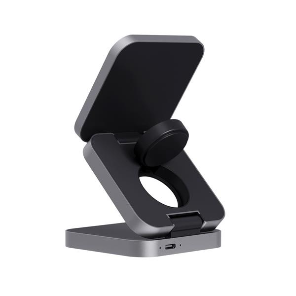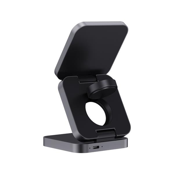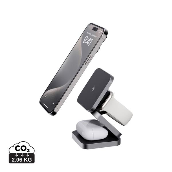 Ładowarka bezprzewodowa 3 w 1, składana, magnetyczna ładowarka bezprzewodowa 15W, ładowarka bezprzewodowa 5W do słuchawek i drobnych akcesoriów, ładowarka bezprzewodowa 2,5W do smartwatchy (tylko iOS), wykonana z PU z recyklingu, działa z telefonami posiadającymi możliwość ładowania indukcyjnego, wejście 9V/3A, wyjście dla telefonu 9 V/1.1 A, 9 V/1.67 A, 15 W, wyjście dla słuchawek 5V/1A, 5W, wyjście smartwatcha 5V/0.5A, kabel 120 cm z TPE z recyklingu w komplecie