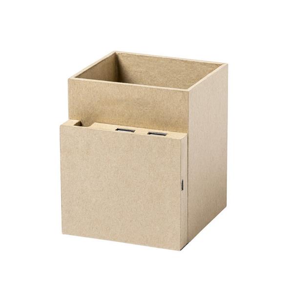 Składana ładowarka bezprzewodowa 5W wykonana z kartonu z recyklingu, działa z telefonami posiadającymi możliwość ładowania indukcyjnego, wejście micro USB 5V/2A, hub USB 2.0 z 2 portami, pojemnik na przybory do pisania, stojak na telefon, kabel micro USB w komplecie