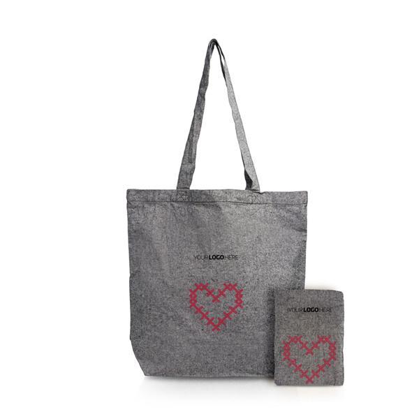 Torba wykonana z bawełny, która pochodzi z recyklingu. Dzięki możliwości złożenia zajmuje bardzo niewiele miejsca. Gramatura 190g/m2 zapewnie odpowiednią wytrzymałość.