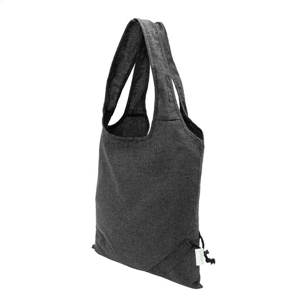 Składana torba na zakupy wykonana w 70% z bawełny pochodzącej z recyklingu i w 30% z poliestru RPET, o gramaturze 140 g/m2. Z charakterystyczną metką z bawełny pochodzącej z recyklingu.