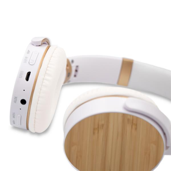 Nauszne słuchawki bezprzewodowe BT 5.0, bambusowe elementy, składane, bateria 200 mAh, czas pracy: 6-8h, czas ładowania: 1-2h, funkcja odbierania połączeń oraz czytnik kart TF (nie dołączona), wbudowany mikrofon, wejście audio, zasięg do 10 m, ładowane przez USB, kabel micro USB w komplecie