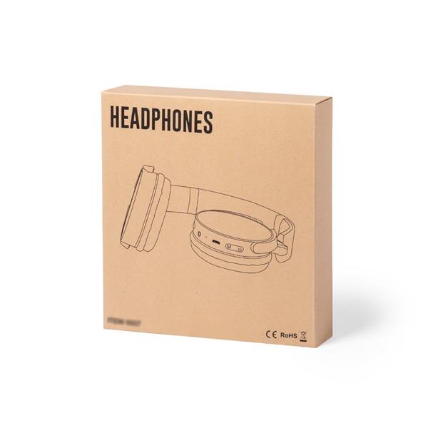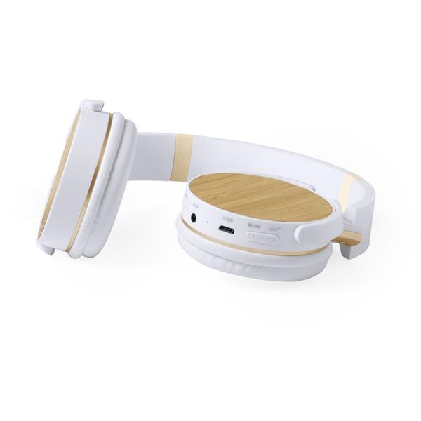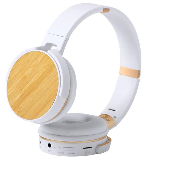 Nauszne słuchawki bezprzewodowe BT 5.0, bambusowe elementy, składane, funkcja odbierania połączeń oraz czytnik kart micro SD (nie dołączona), wbudowany mikrofon, radio, bateria 200 mAh, wejście Jack 3,5 mm, zasięg do 10 m, ładowane przez USB, kabel micro USB w komplecie