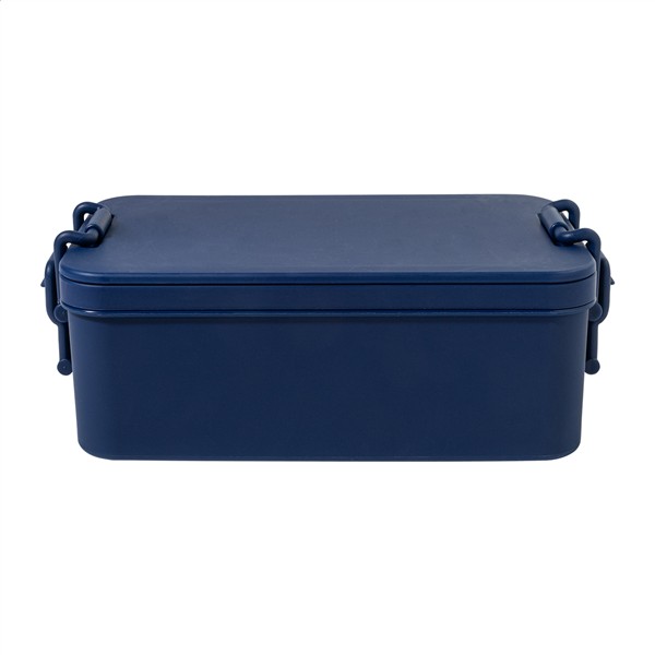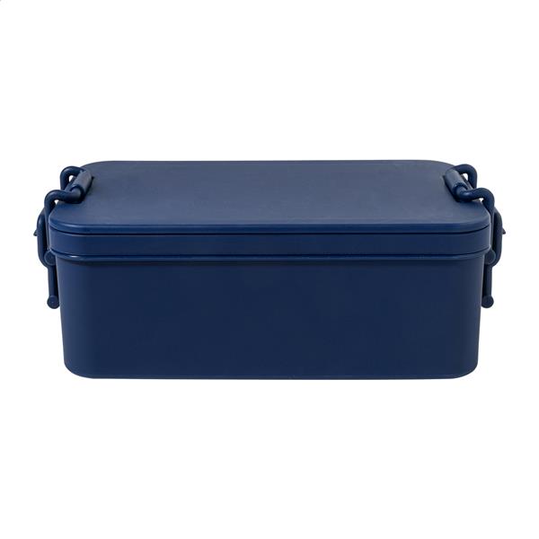 Lunchbox z tworzywa PP z zestawem sztućców (widelec, łyżka i nóż), zapięciem na klamrę i 2 przegrodami (1000 ml i 800 ml). Możliwość układania w stosy, co zapewnia kompaktowe przechowywanie.