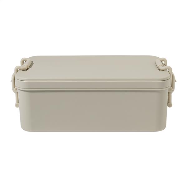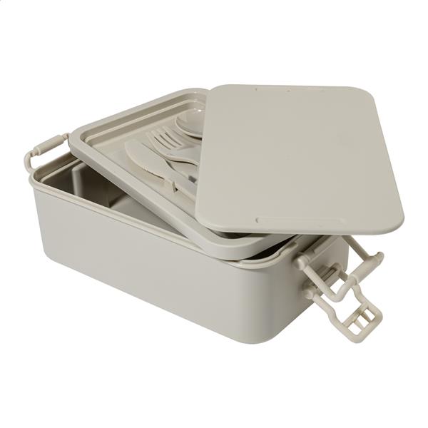 Lunchbox z tworzywa PP z zestawem sztućców (widelec, łyżka i nóż), zapięciem na klamrę i 2 przegrodami (1000 ml i 800 ml). Możliwość układania w stosy, co zapewnia kompaktowe przechowywanie.