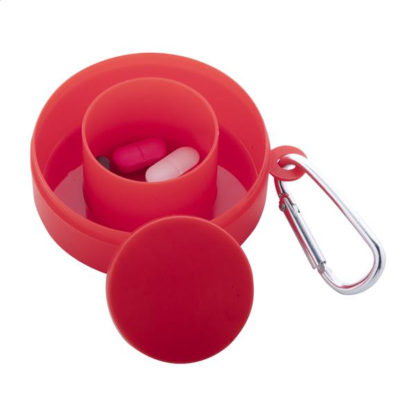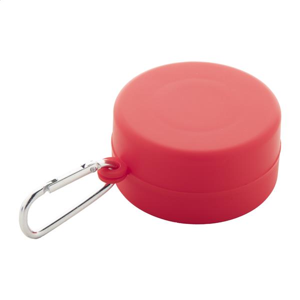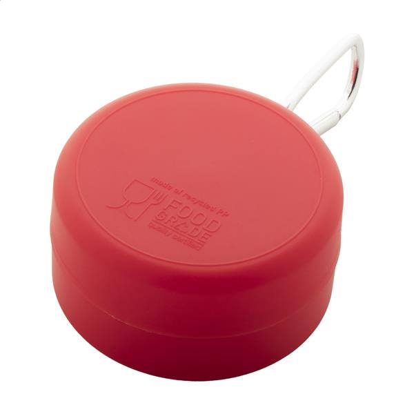 Składany kubek z tworzywa sztucznego PP z recyklingu z podziałką na tabletki i metalowym karabińczykiem. 220 ml. Bez BPA.