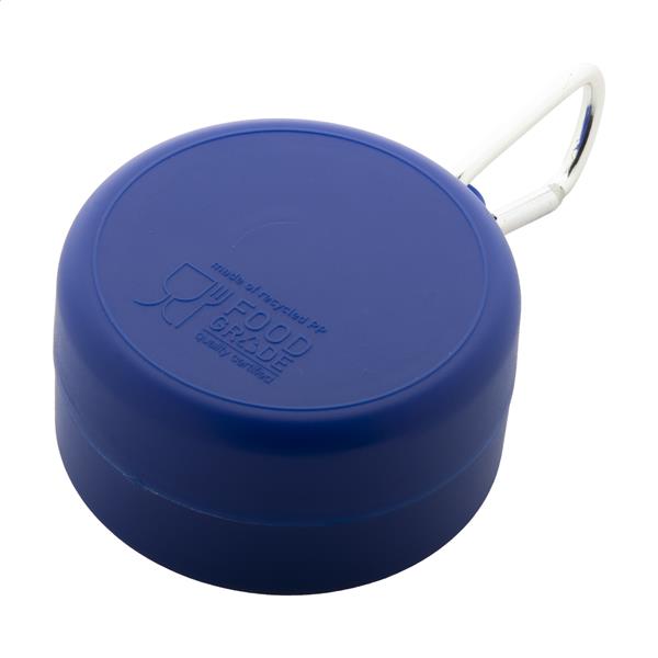 Składany kubek z tworzywa sztucznego PP z recyklingu z podziałką na tabletki i metalowym karabińczykiem. 220 ml. Bez BPA.