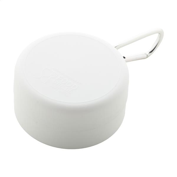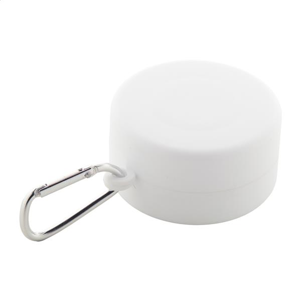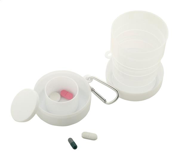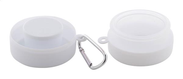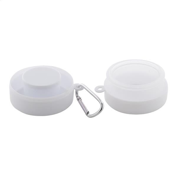 Składany kubek z tworzywa sztucznego PP z recyklingu z podziałką na tabletki i metalowym karabińczykiem. 220 ml. Bez BPA.