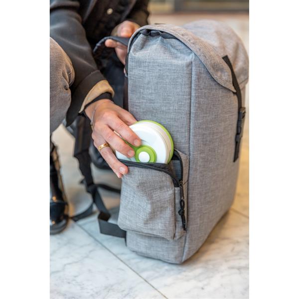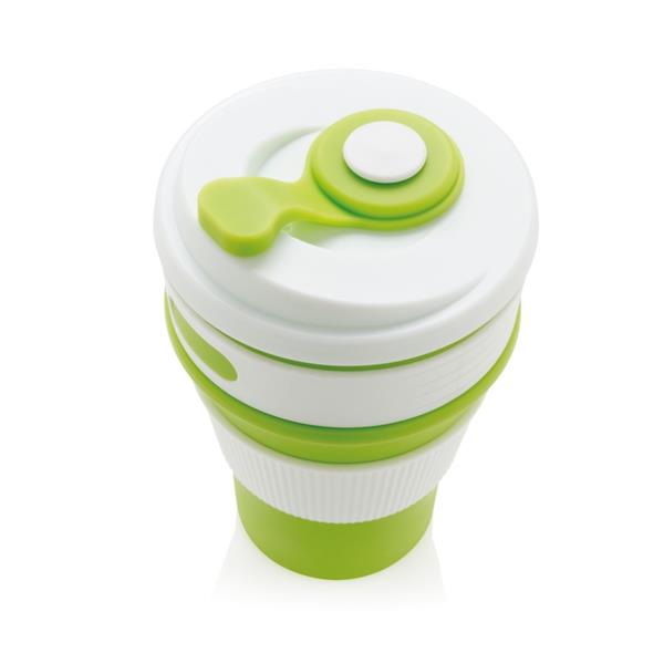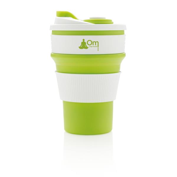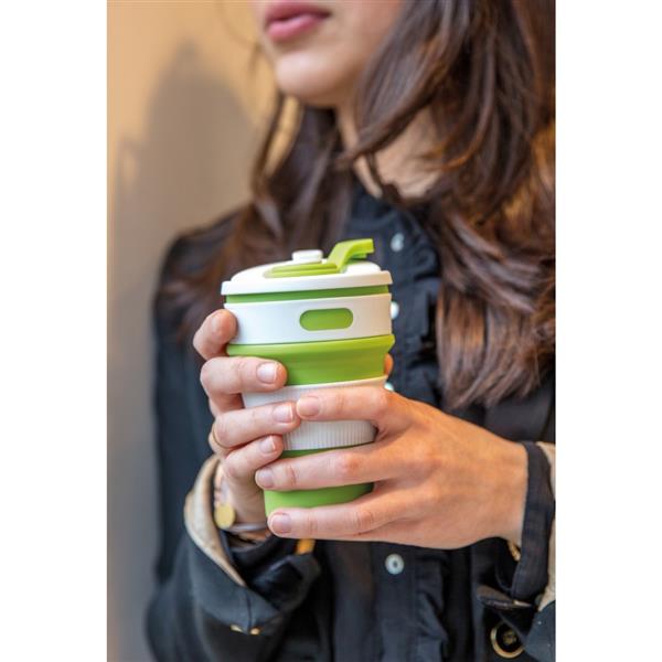 Kubek podróżny 350 ml, składany, wykonany w 100% ze spożywczego materiału silikonowego, nieprzywierająca powłoka, szczelny, elastyczny, przed pierwszym użyciem należy zanurzyć kubek na kilka minut w gotującej wodzie, można myć w zmywarce, ślad węglowy produktu: 0,83 kg CO2