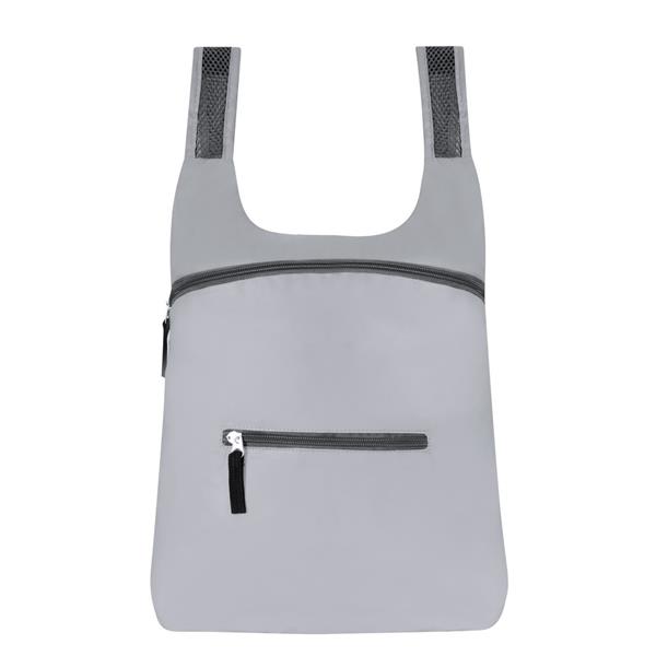 Składany plecak z zapięciem na zamek błyskawiczny, regulowane paski na ramię umożliwiające dopasowanie ich długości do własnych preferencji, produkt wykonany z poliestru 210D RPET
