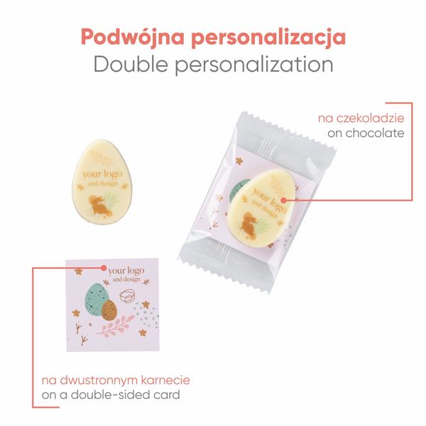 Czekolada w kształcie jajka dostępna jest w zestawie z karnetem. Szatę graficzną karnetu spersonalizujemy dla Ciebie, umieszczając Twoje logo, hasło i treść np. życzenia oraz grafikę.