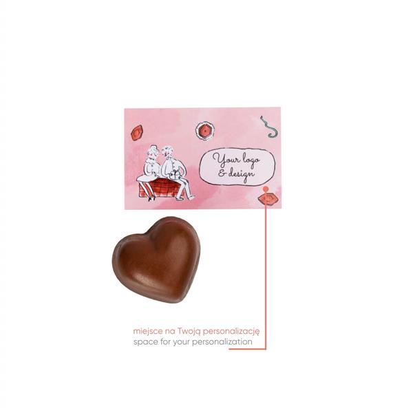 Do pralinki dołączona jest papierowa karta, którą spersonalizujemy według Twojego życzenia, prezentując na niej Twoje logo, grafikę, zdjęcie, hasło lub wiadomość. Dlatego nasze czekoladowe serduszka to idealny sposób, aby przekazać życzenia lub podarować miły upominek niezależnie od okazji. To może być słodka forma, by zaprosić klientów do nowej siedziby lub poinformować o rebrandingu.