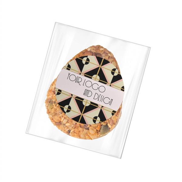 Batonik zabezpieczony jest folią kompostowalną. Opakowanie zdobi etykieta, wykonana z papieru z certyfikatem FSC – którą przeznaczamy całkowicie dla Twojej dyspozycji. Możesz ją w pełni spersonalizować, więc powiedz, z jakim przekazem chcesz trafić do odbiorców, a my wyeksponujemy na etykiecie dowolną grafikę lub treść i oczywiście – Twoje logo.