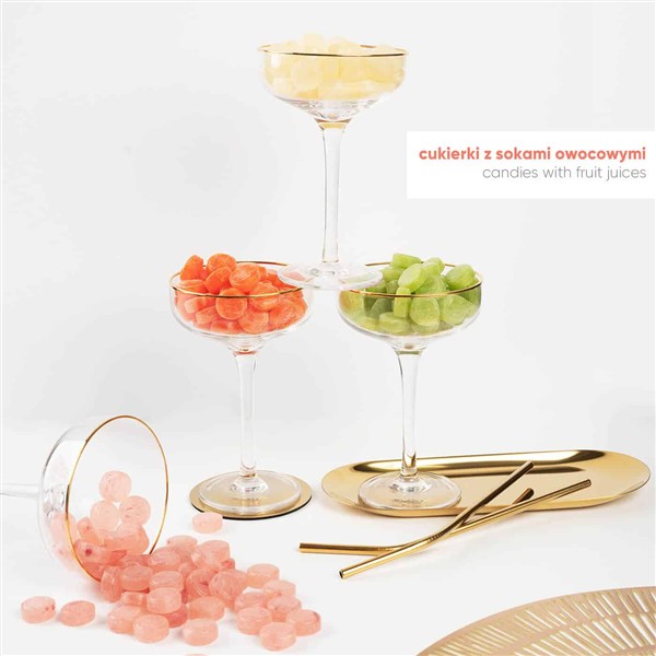 Polecamy też soczyście owocowy wariant – cukierki z dodatkiem soków owocowych. Dostępne są w 4 wersjach smakowych: jabłko, truskawka, pomarańcza i cytryna. Ich kolor i smak to zasługa naturalnych soków owocowych.